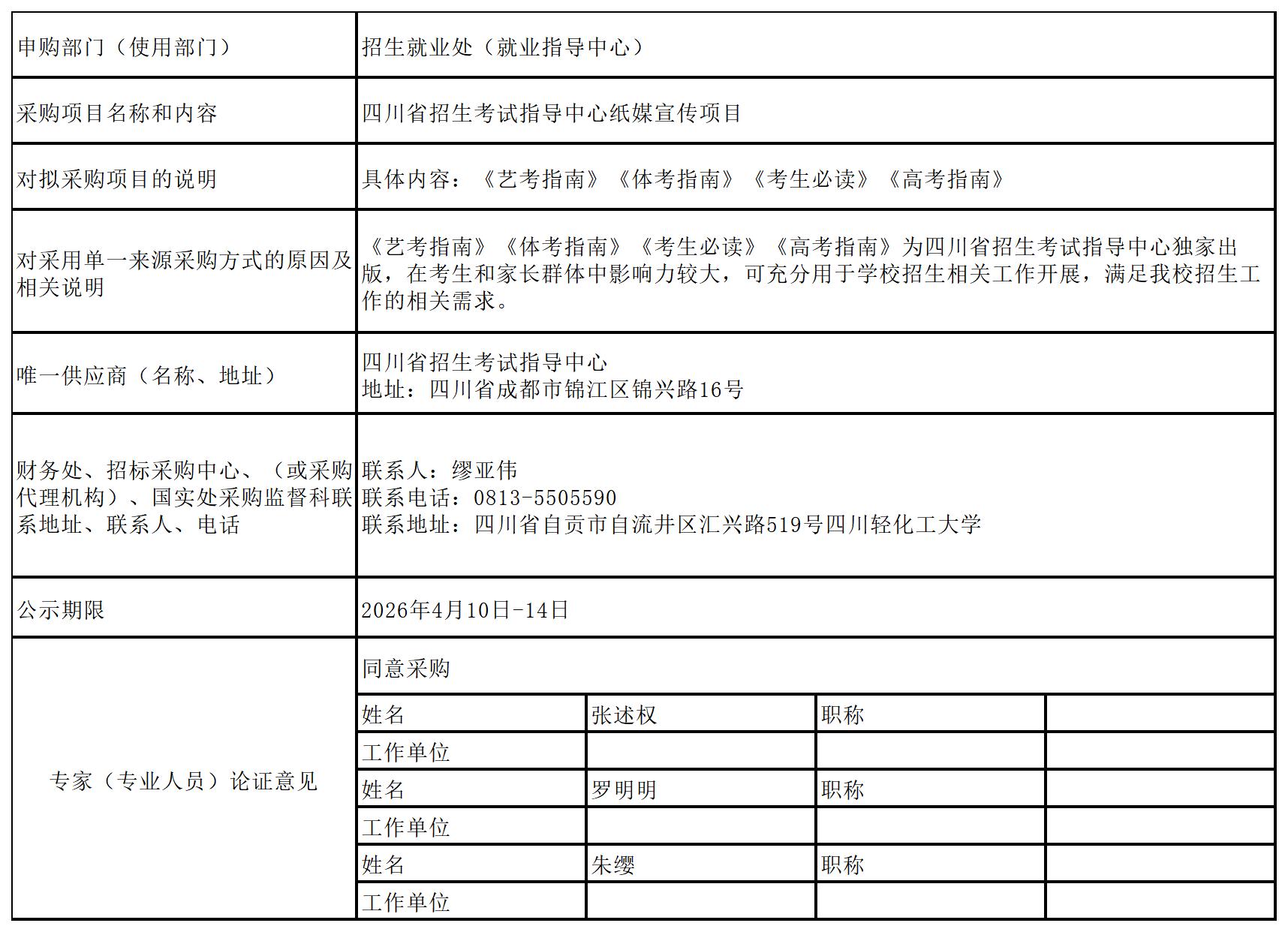 四川轻化工大学单一来源采购方式专家论证意见公示